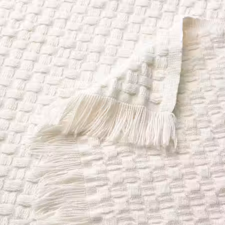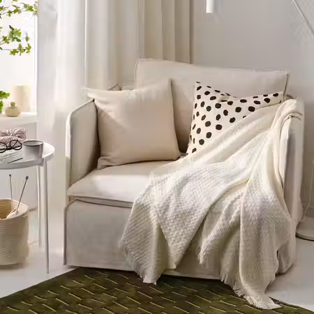 Плед ХОРНМАЛ умиротворяющего приглушенно-белого цвета получился легким и теплым.