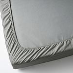 Натяжная серо-зеленая простыня ДВАЛА изготовлена из дышащей и поглощающей влагу хлопковой ткани, что обеспечивает ровную и комфортную температуру в течение всей ночи.