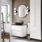 Кажется, что раковина парит над столешницей, так как она установлена на приподнятое над поверхностью кольцевое основание.