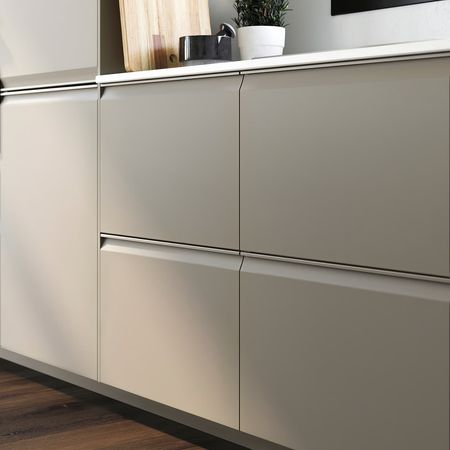 Матовые фасады кухонных шкафов УППЛЁВ бежевого цвета выполнены в утонченном современном стиле и дополнены скошенными краями и встроенными ручками в тон.
