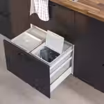 Установив опору для контейнеров в высокий ящик МАКСИМЕРА, вы организуете закрытое удобное решение для сортировки мусора.