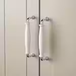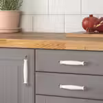 Белые ручки удобной формы, напоминающие фарфор, подчеркнут традиционный стиль вашей кухни.