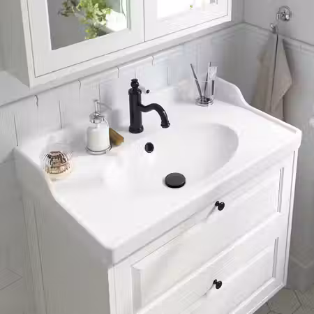 Округлые матовые ручки КЛИНГСТОРП белого или черного цвета, напоминающие традиционные фарфоровые, привнесут в интерьер очарование деревенского стиля.