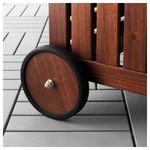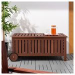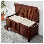 На этой скамье можно не только сидеть, но и использовать ее для хранения подушек, садовых инструментов и кашпо. Легко передвигать благодаря колесикам. Мебель обработана полупрозрачной морилкой в несколько слоев.