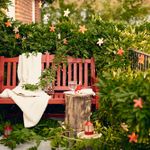 Красный цвет оживит пространство балкона и придаст садовой скамье выразительность в вашем зеленом оазисе.