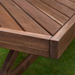 Планки столешницы образуют узор «елочка». Они расположены с небольшими промежутками, в которые может стекать дождевая вода, но не упадут столовые приборы.