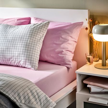 Серо-зеленая простыня ДВАЛА изготовлена из дышащей и поглощающей влагу хлопковой ткани, что обеспечивает ровную и комфортную температуру в течение всей ночи.