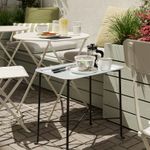 Съемный поднос можно использовать для сервировки. Конструкция позволяет легко установить поднос на каркас, не вставляя ни в какие пазы или отверстия. Столик отличается прочностью и простотой в уходе — он изготовлен из стали с порошковым покрытием и гальванизованной стали. Материалы, из которых изготовлена эта садовая мебель, не требуют ухода. Легко поддерживать в чистоте — достаточно протереть влажной тканью.