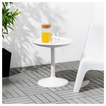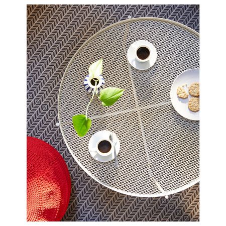 Съемную столешницу можно использовать как сервировочный поднос. Материалы, из которых изготовлена эта садовая мебель, не требуют ухода. Легко поддерживать в чистоте – достаточно протереть влажной тканью. Можно дополнить креслом ИКЕА ПС ВОГЭ.