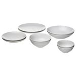 В набор входит: 2 тарелки (диам. 26 см), 2 десертные тарелки (диам. 20 см), 2 миски (диам. 16 см, высота 6 см), 2 миски (диам. 12 см, высота 5 см) и 2 глубокие тарелки (диам. 23 см).