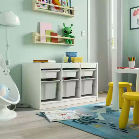 Каркас ТРУФАСТ в сочетании с вместительными сетчатыми контейнерами для хранения выглядит лаконично и сдержанно, что делает их идеальным решением для комнаты подростка.