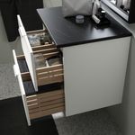 В глубоком нижнем ящике удобно хранить полотенца и фен, а в верхнем ящике достаточно места для бутылочек с шампунем и гелем для душа и разных мелочей.