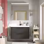 Минималистичный дизайн в сочетании с матовой отделкой темно-серого цвета наполняет ванную комнату теплом и ощущением спокойствия, при этом ванной легко придать индивидуальность, выбрав понравившиеся ручки.