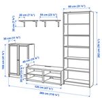 В этой готовой комбинации есть тумба под ТВ, навесные полки, вместительный шкаф с дверцами и высокий стеллаж.