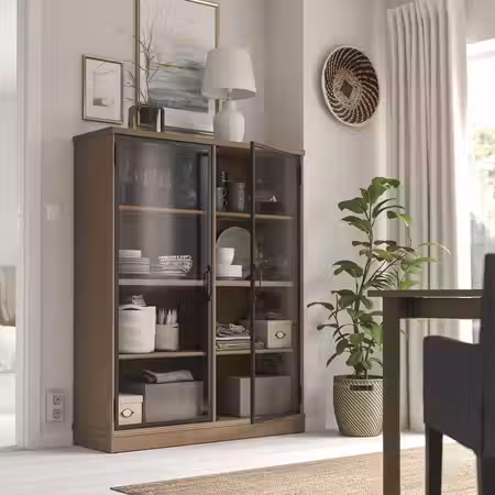 2 закрепленные полки для большей устойчивости. Регулируемые ножки; обеспечивают устойчивость даже на неровном полу. Карниз и цокольная планка придают законченный вид, когда две или более секций объединяются вместе. Дверцы со стеклянной вставкой обеспечивают защиту содержимого от пыли и позволяют Вам продемонстрировать вещи или спрятать их от посторонних глаз. Съемные полки позволяют регулировать пространство.