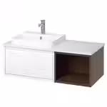 В этой комбинации с одним выдвижным ящиком и одним открытым шкафом достаточно места для всего необходимого, а благодаря навесному способу установки ванная комната выглядит просторнее.