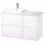 В комплект входит: 2 шкафа под раковину с ящиками, 1 столешница, 1 полуутопленная раковина, 1 сифон и 1 смеситель.