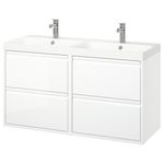 В комплект входит: 2 шкафа под раковину с ящиками, 1 интегрированная раковина, 1 сифон и 2 смесителя.