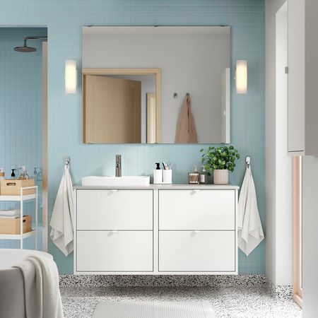 Мебель для ванной ЭНГШЁН выглядит современно и лаконично с минимумом деталей.