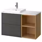 В комплект входит: 1 шкаф под раковину с ящиками, 1 открытый шкаф, 1 столешница, 1 полуутопленная раковина, 1 сифон и 1 смеситель.
