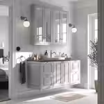 Эта комбинация состоит из трёх шкафов под раковину с полками для более крупных предметов, например высоких бутылок или рулонов туалетной бумаги, и выдвижными ящиками, в которых легко организовать хранение и видно все вещи.