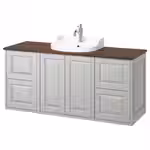 В комплект входит: 2 шкафа под раковину с ящиками, 1 шкаф под раковину с дверями, 1 столешница, 1 накладная раковина, 1 сифон и 1 смеситель.