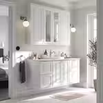 Эта комбинация состоит из трёх шкафов под раковину с полками для более крупных предметов, например высоких бутылок или рулонов туалетной бумаги, и выдвижными ящиками, в которых легко организовать хранение и видно все вещи.