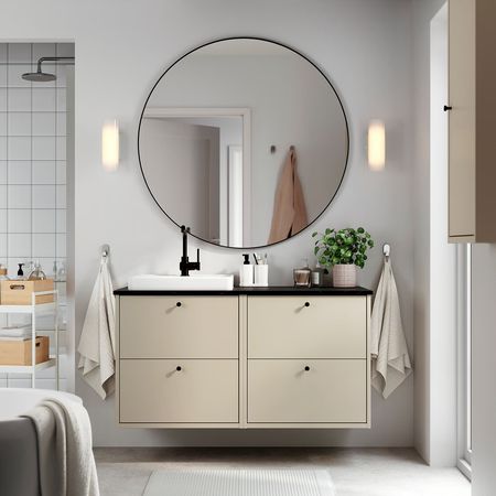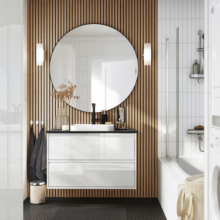 Мебель для ванной ЭНГШЁН выглядит современно и лаконично с минимумом деталей.