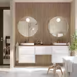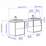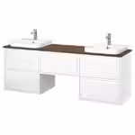 В комплект входит: 2 шкафа под раковину с ящиками, 1 шкаф с ящиком, 1 столешница, 2 полуутопленные раковины, 2 сифона и 2 смесителя.