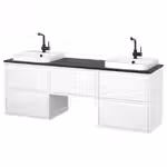 В комплект входит: 2 шкафа под раковину с ящиками, 1 шкаф с ящиком, 1 столешница, 2 полуутопленные раковины, 2 сифона и 2 смесителя.