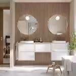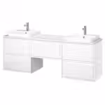 В комплект входит: 2 шкафа под раковину с ящиками, 1 шкаф с ящиком, 1 столешница, 2 полуутопленные раковины, 2 сифона и 2 смесителя.