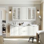 Идеальное решение для хранения самых разных вещей: более крупные предметы можно положить на полки шкафов, а всё остальное — в выдвижные ящики. В общей ванной станет намного комфортнее, если у вас будет две раковины и столешница