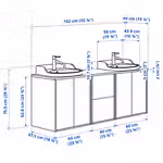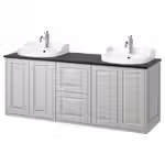 В комплект входит: 1 шкаф под раковину с ящиками, 2 шкафа под раковину с дверьми, 1 столешница, 2 полуутопленные раковины, 1 сифон и 2 смесителя.