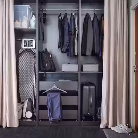 В гардеробе на платяной штанге есть место для хранения вещей на плечиках, в проволочной корзине и на нескольких полках — для одежды в сложенном виде, а в ящиках — для носков и белья.