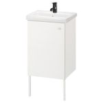 Дверцу можно навесить справа или слева.Отличное решение для маленькой ванной комнаты, ведь ширина напольного шкафа всего 40 см.Напольный шкаф для раковины прекрасно вмещает все принадлежности для гигиены, которые обычно создают ощущение беспорядка.