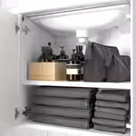 Напольный шкаф под раковину с удобной полкой для полотенец и предметов личной гигиены, которые часто становятся причиной беспорядка.