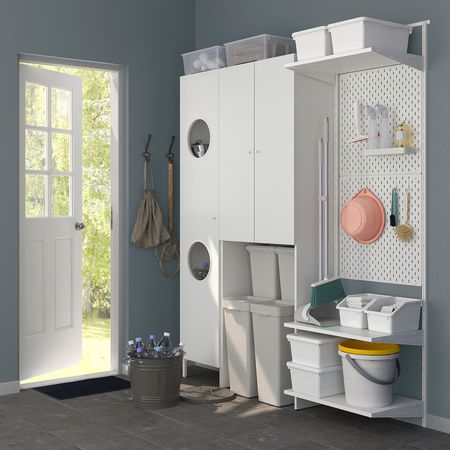 В шкафу под раковиной поместятся полотенца, корзины с мелочами и запасы туалетной бумаги.
