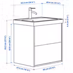 В комплект входит: 1 шкаф под раковину с ящиками, 1 интегрированная раковина, 1 сифон и 1 смеситель.