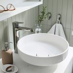 Раковина изготовлена из мраморной крошки, что позволяет оставить края узкими и делает поверхность устойчивой к появлению царапин.