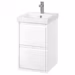 Современный стиль мебели для ванной из серии ÄNGSJÖN подчеркивается интегрированными ручками и лаконичным дизайном.