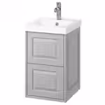В комплект входит: 1 шкаф под раковину с ящиками, 1 интегрированная раковина, 1 сифон и 1 смеситель.