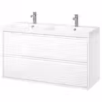 В комплект входит: 1 шкаф под раковину с ящиками, 1 интегрированная раковина, 1 сифон и 2 смесителя.