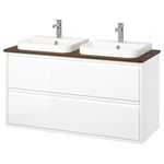 В комплект входит: 1 шкаф под раковину с ящиками, 1 столешница, 2 полуутопленные раковины, 1 сифон и 2 смесителя.