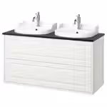 В комплект входит: 1 шкаф под раковину с ящиками, 1 столешница, 2 полуутопленные раковины, 1 сифон и 2 смесителя.