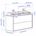 В комплект входит: 1 шкаф под раковину с ящиками, 1 столешница, 2 полуутопленные раковины, 1 сифон и 2 смесителя.