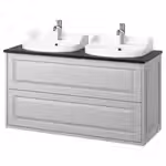 В комплект входит: 1 шкаф под раковину с ящиками, 1 столешница, 2 полуутопленные раковины, 1 сифон и 2 смесителя.