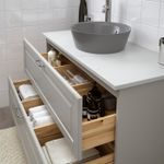 В глубоком нижнем ящике удобно хранить полотенца и фен, а в верхнем ящике достаточно места для бутылочек с шампунем и гелем для душа и разных мелочей.