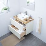 Современный стиль мебели для ванной из серии ÄNGSJÖN подчеркивается интегрированными ручками и лаконичным дизайном.