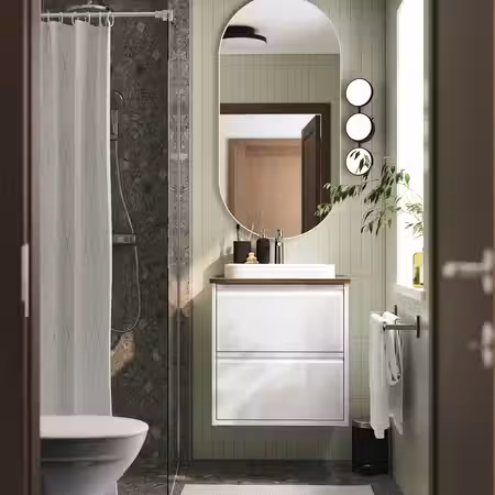 Мебель для ванной ЭНГШЁН выглядит современно и лаконично с минимумом деталей.
