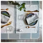 Скатерть НИССЁГА с рисунком в нейтральных тонах изготовлена из хлопка и джута.